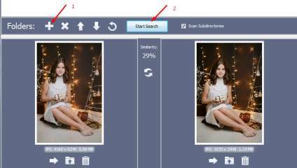 "Click on the '+' and select one or more folders with photos. Then, click on the 'Start Search' button to start searching for duplicates."
